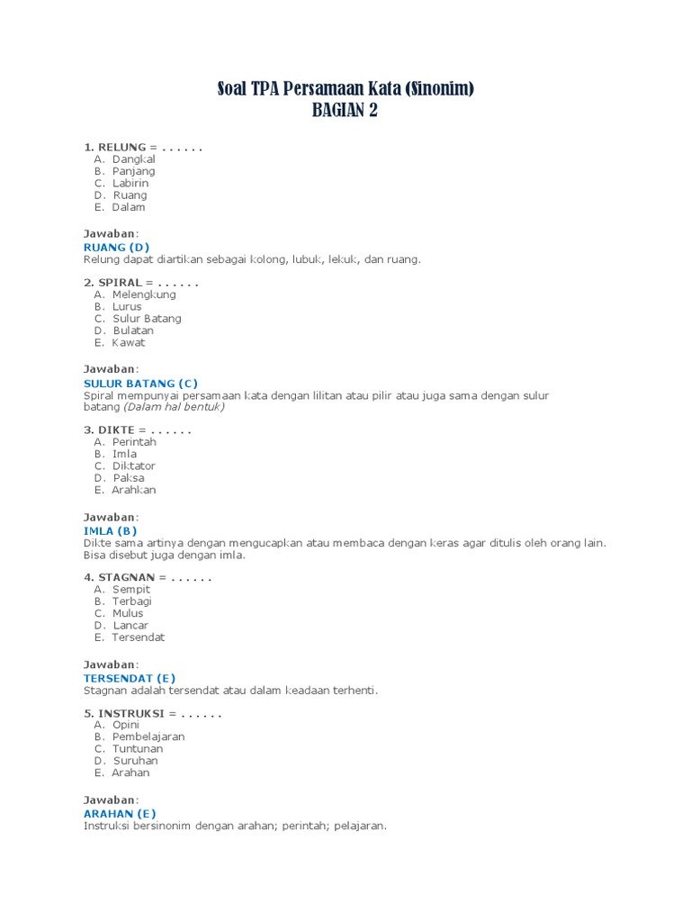 Semoga dapat membantu kalian yang akan tes ujian, tes. Halaman ini berguna untuk mencari sinonim atau persamaan atau kata lain dari suatu kata. Sabar memiliki dua sisi, sisi yang satu adalah sabar, sisi yang lain adalah bersyukur. Dalam sudut pandang bahasa, sinonim membuat sebuah kalimat menjadi lebih menarik. Dalam memilih kata guru pada kalimat (1) bermaksud bahwa kita ingin menunjukkan kata yang umum.